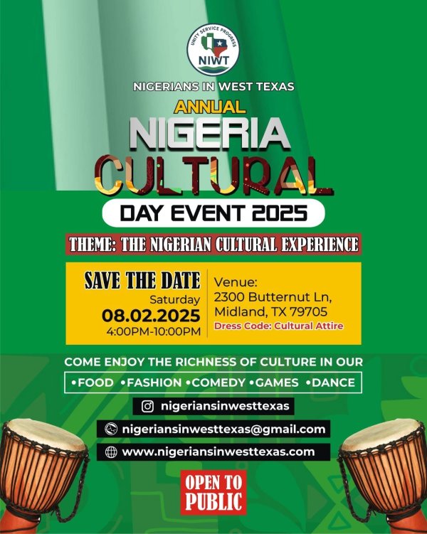 The Annual Nigeria Cultural Day Event 2025, hosted by Nigerians in West Texas (NIWT), will be held on Saturday, August 2, 2025, from 4:00 PM to 10:00 PM at 2300 Butternut Ln, Midland, TX 79705. The theme is “The Nigerian Cultural Experience”, and attendees are encouraged to wear cultural attire.