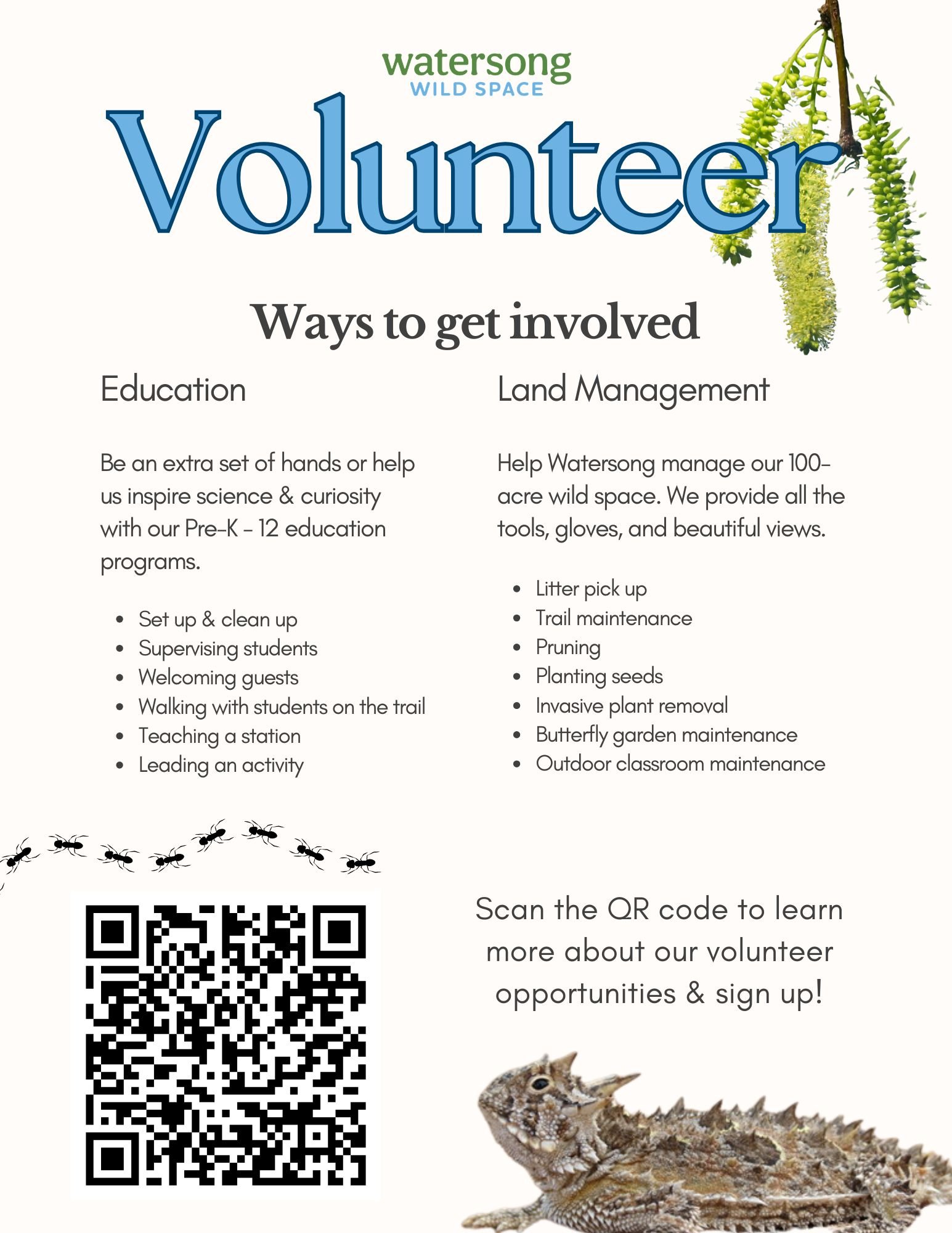 Watersong Wild Space has a multitude of volunteer needs that may be perfect for you!